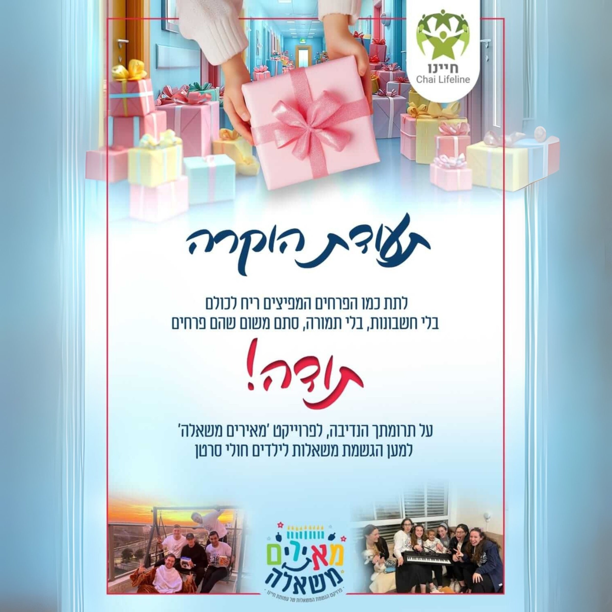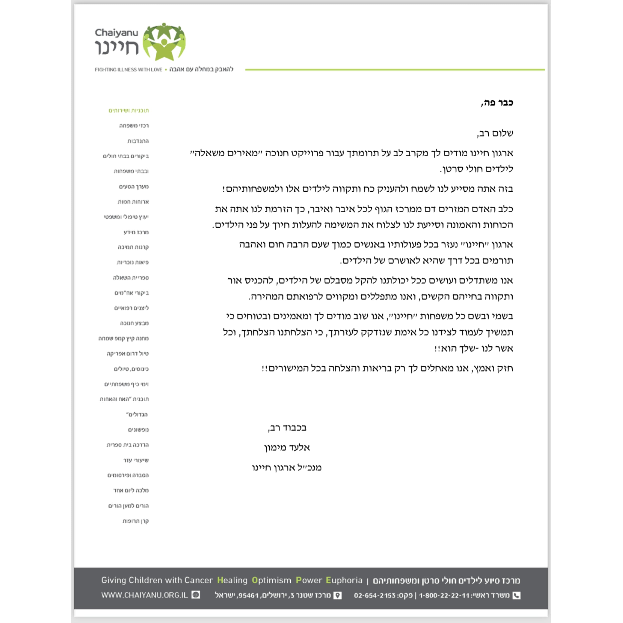 לאחרונה זכינו לתרום לעמותה התומכת בחולי סרטן, וקיבלנו מהם תמונות ומכתבי תודה מרגשים.